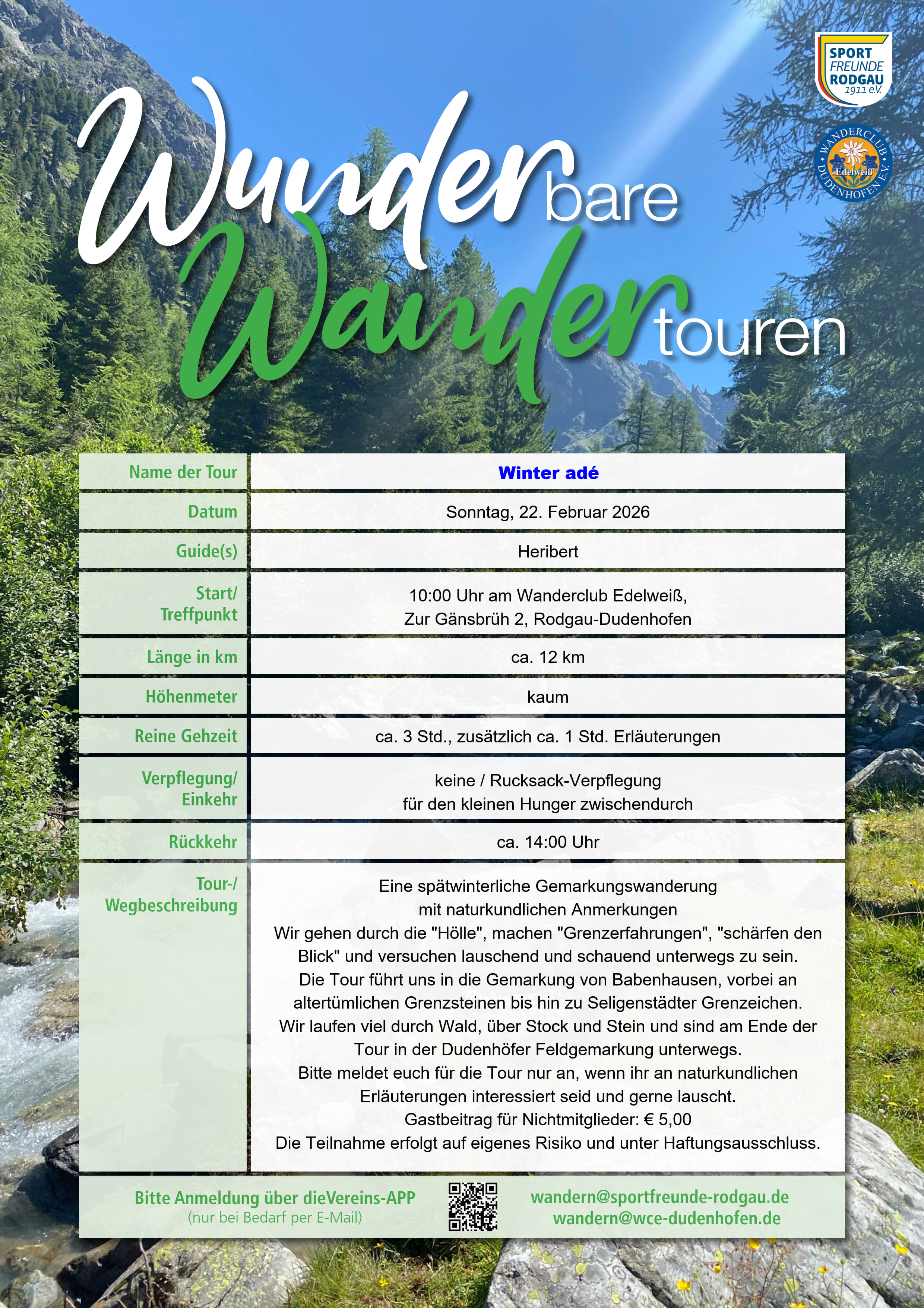 Es werden kurze Trinkpausen eingeplant. Beitrag für Gastwanderer 5,00 Euro.