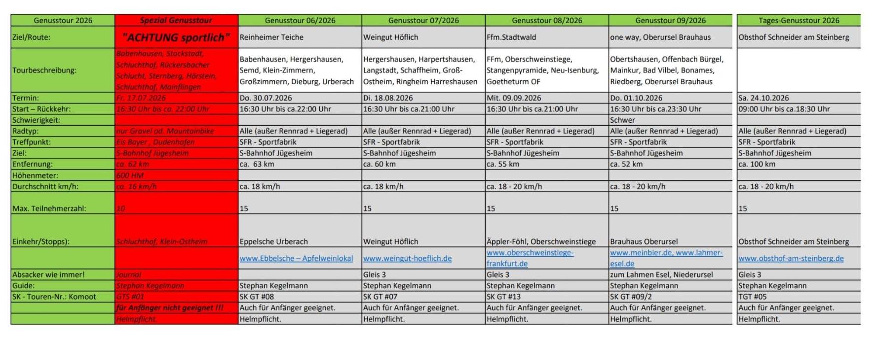 Hier eine Übersicht über unsere Radtourenangebote. Die offiziellen Touren werden in der Vereins-App als Termin eingestellt. Bitte darüber auch buchen.