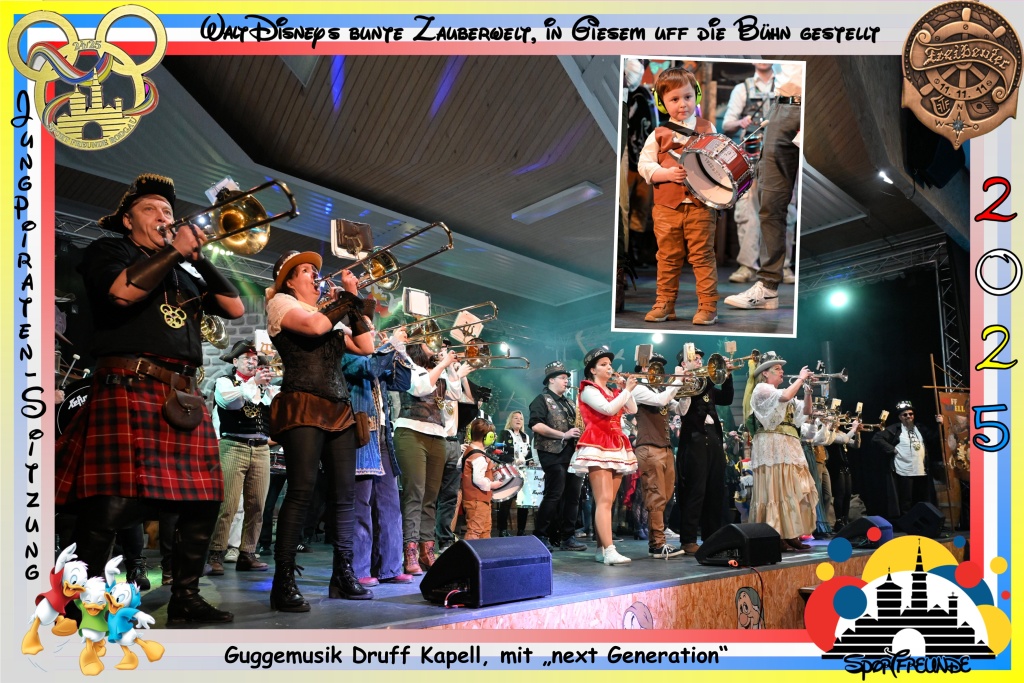 Bevor es dann in die Pause von zweimal 11 Minuten ging, brachte die Guggemusik „Druff Kapell“, unter der Leitung von Silke Seum, den Saal nochmal richtig zum Beben.