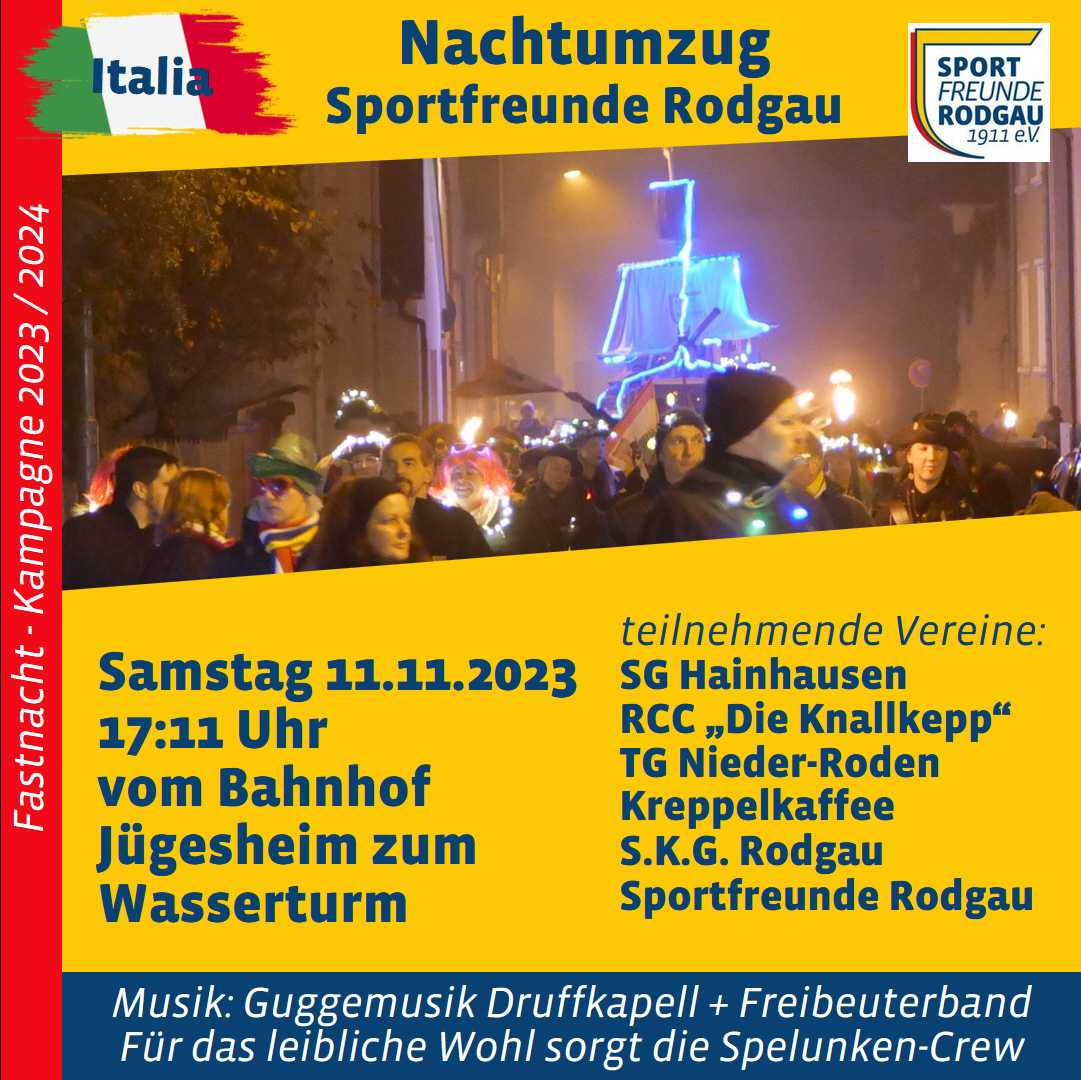 Die Sportfreunde Rodgau und die kooperierenden Fastnachts-Vereine laden ein zum großen Nachtumzug der Kampagne 2023 / 2024.