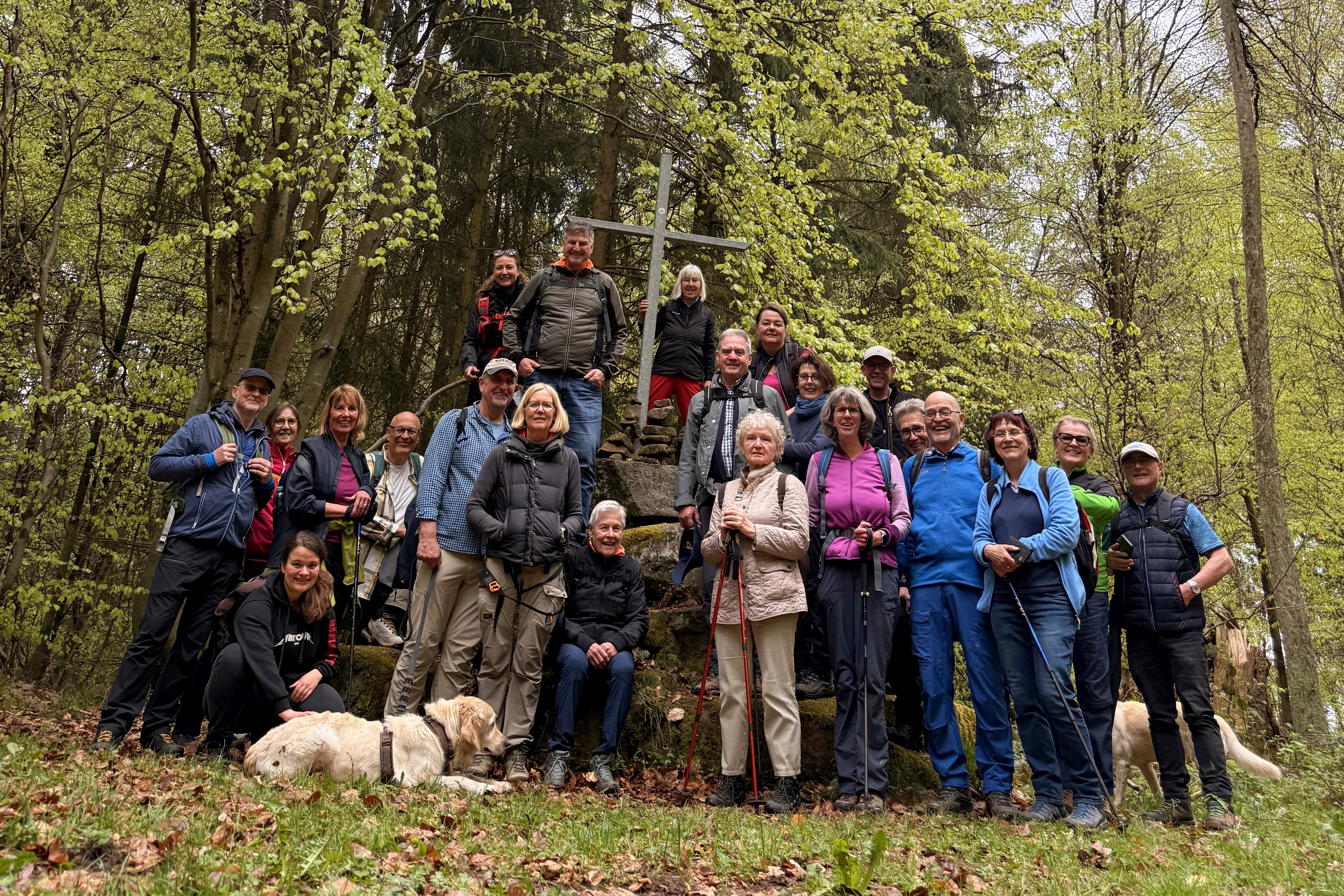 Es ging einen Kulturweg hinauf über die Weinberge mit herrlichen Blicken über das Maintal. Der Wald strahlte im frischen Grün. Weiter an blühenden Apfelbäumen vorbei zum Rosshof. Nun galt es, auf der anderen Talsseite den Weiler Klotzenhof zu erreichen. Ein zweiter steiler Anstieg auf steinigem Pfad forderte von den Teilnehmenden vollen Einsatz. Nun führte der Eselsweg am Hunnenstein vorbei zur Einkehr im Kloster Engelberg.