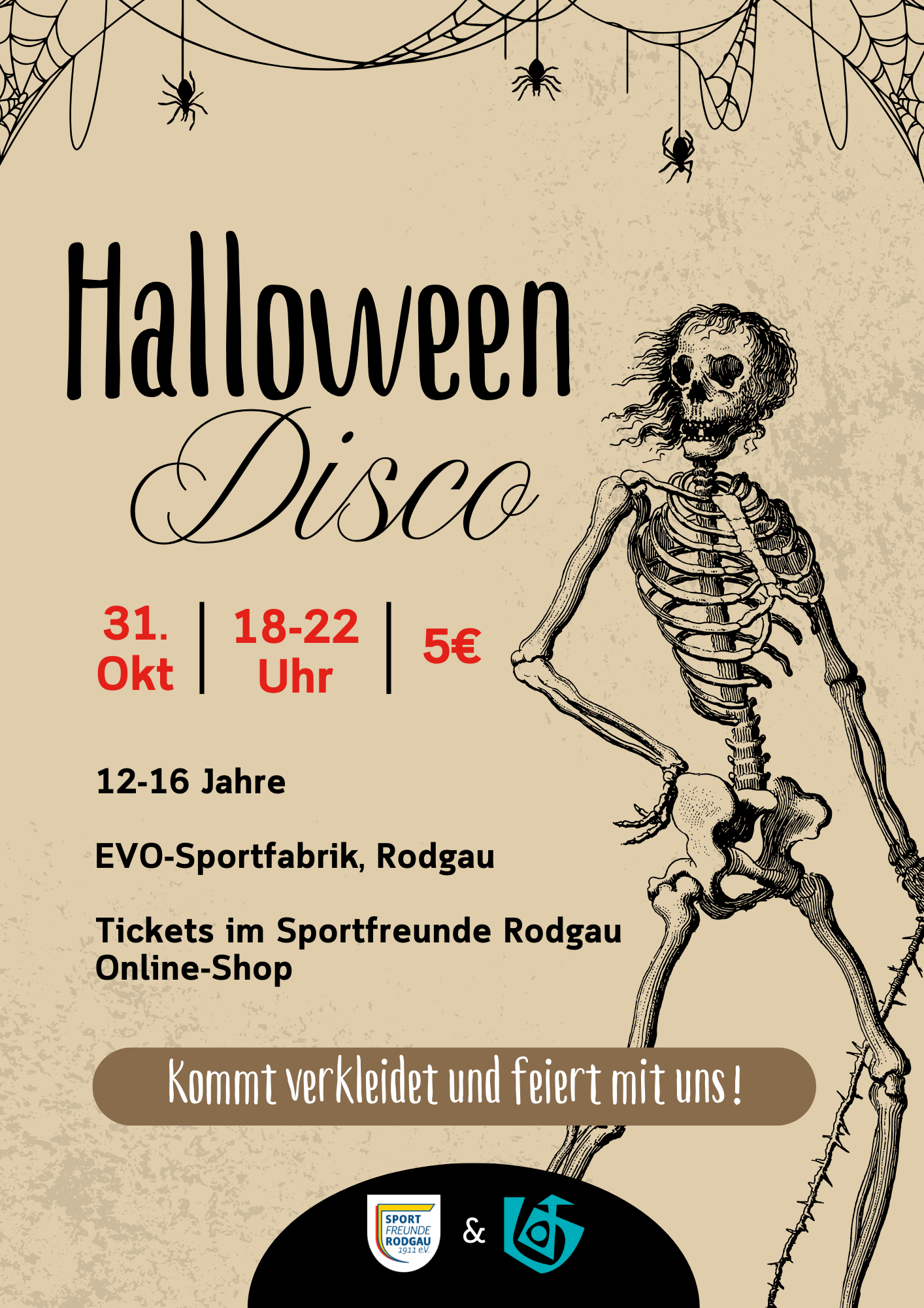 Gemeinsam mit der KJG Jügesheim veranstalten wir am 31. Oktober eine Halloweendisco in unserer EVO-Sportfabrik! Was ihr machen müsst? Verkleidet euch und holt euch in unserem Online Ticketshop ein Ticket. Abendkasse wird es nur geben, wenn nicht alle Tickets verkauft werden :)