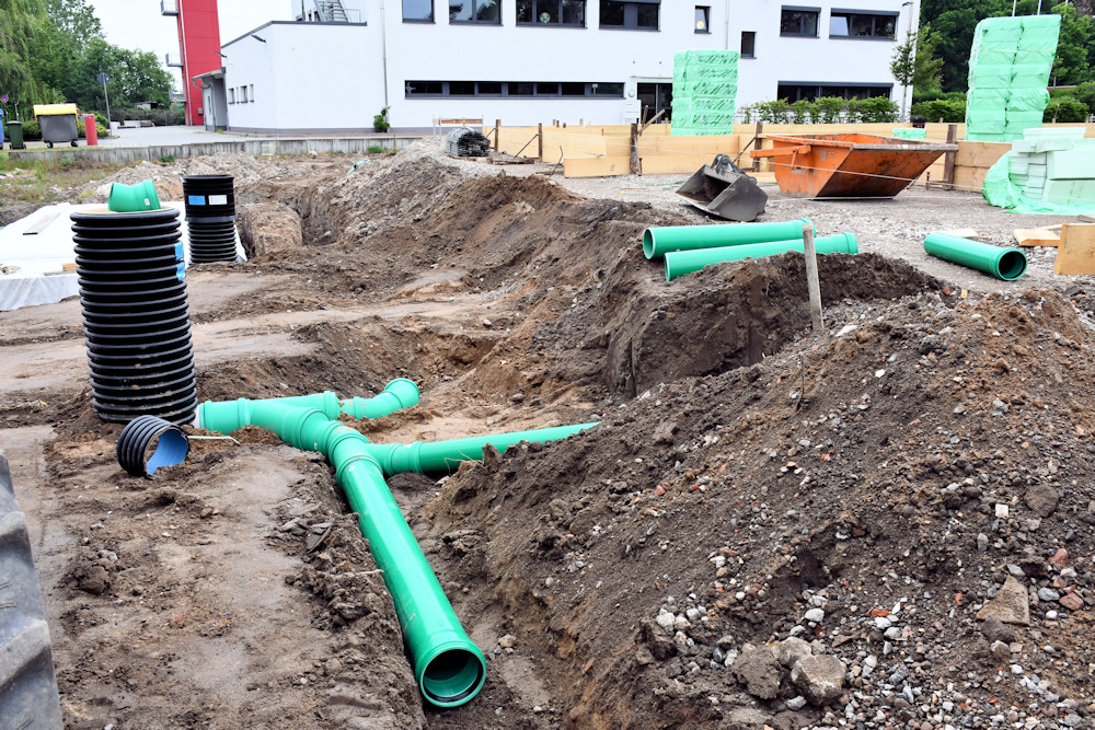 Abwasserleitungen, Erdungs-/Blitzschutzanlage sind eingebracht. Eine Sauberkeitsschicht ist aufgetragen und die Dämmung verlegt. Die Rigolen (Versickerungsanlage) ist eingebaut. In der 20. Kalenderwoche wird die Bodenplatte fertig gestellt werden. Danach werden die Aufschüttungsarbeiten im Auftrag der Stadt Rodgau abgeschlossen. Dann folgt der nächste Schritt mit der Errichtung des Holzbauwerks.