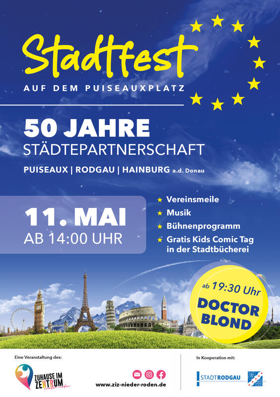 Die Stadt Rodgau feiert das Partnerschaftsjubiläum mit Puiseaux und Hainburg mit einem großen Fest am 11. Mai 2024 auf dem Puiseauxplatz in Nieder-Roden.