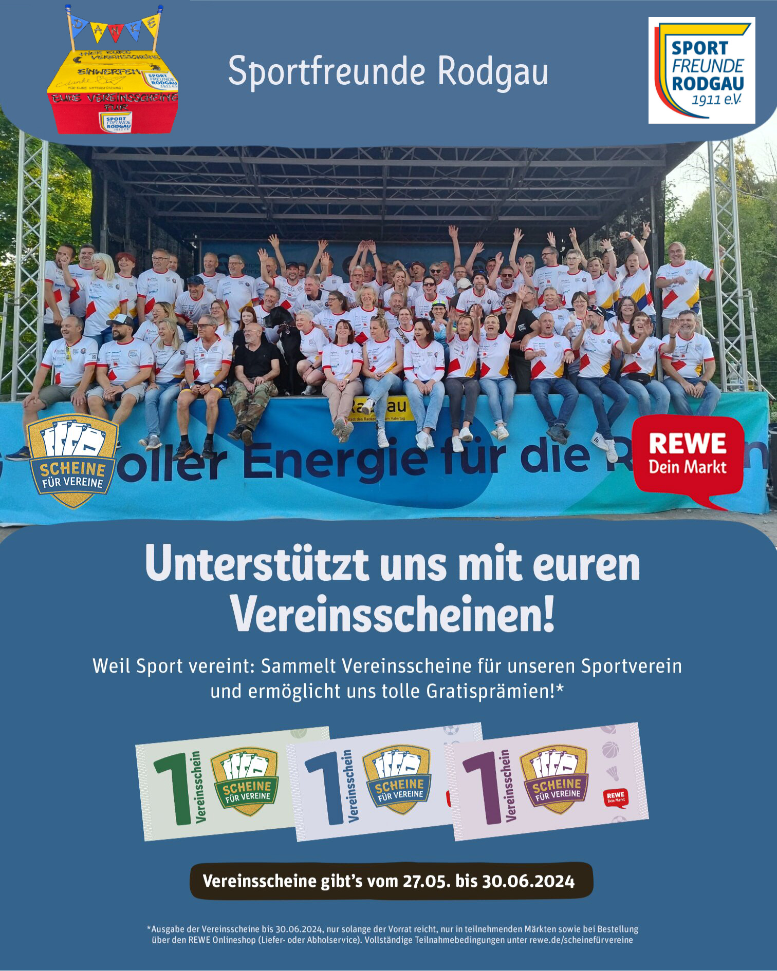 In den REWE-Märkten in Hainhausen, Jügesheim, Dudenhofen und Nieder-Roden sind Sammelboxen der Sportfreunde Rodgau aufgestellt, in die Ihr direkt nach dem Einkauf Eure Scheine einwerfen könnt oder alternativ in den Briefkasten der Sportfreunde Rodgau in der Weiskircher Str. 140.
